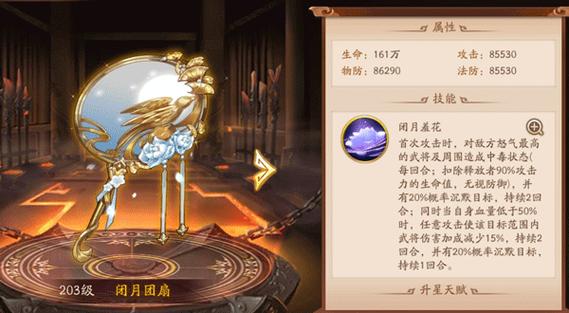 从技能机制来看,扇子的核心价值体现在其“沉默”与“毒伤”双重效果上。首次攻击触发的十字范围中毒效果能够造成持续两回合的百分比伤害,满星状态下毒伤比例高达200%,显著弥补了爆发型武将缺乏持续输出的短板。这种跨回合的伤害机制尤其适合对抗高防御目标,例如在攻城战中,毒伤可无视敌方城墙的部分防御属性,实现稳定破局。而沉默效果作为游戏中最强控制手段之一,初始20%的概率虽看似有限,但通过升星强化后最高可达70%,配合貂蝉等控制型武将时甚至能形成“双沉默链”,彻底封锁敌方核心技能释放。值得注意的是,这种控制效果无法被闪避,在后期PVP对抗中往往成为胜负手。